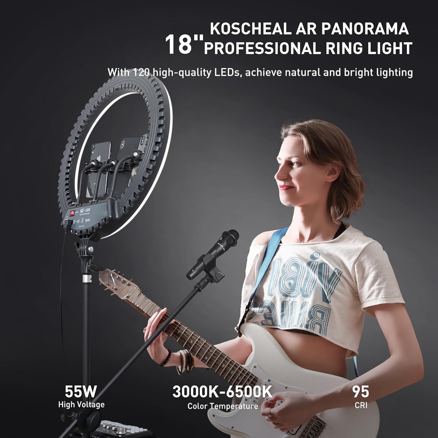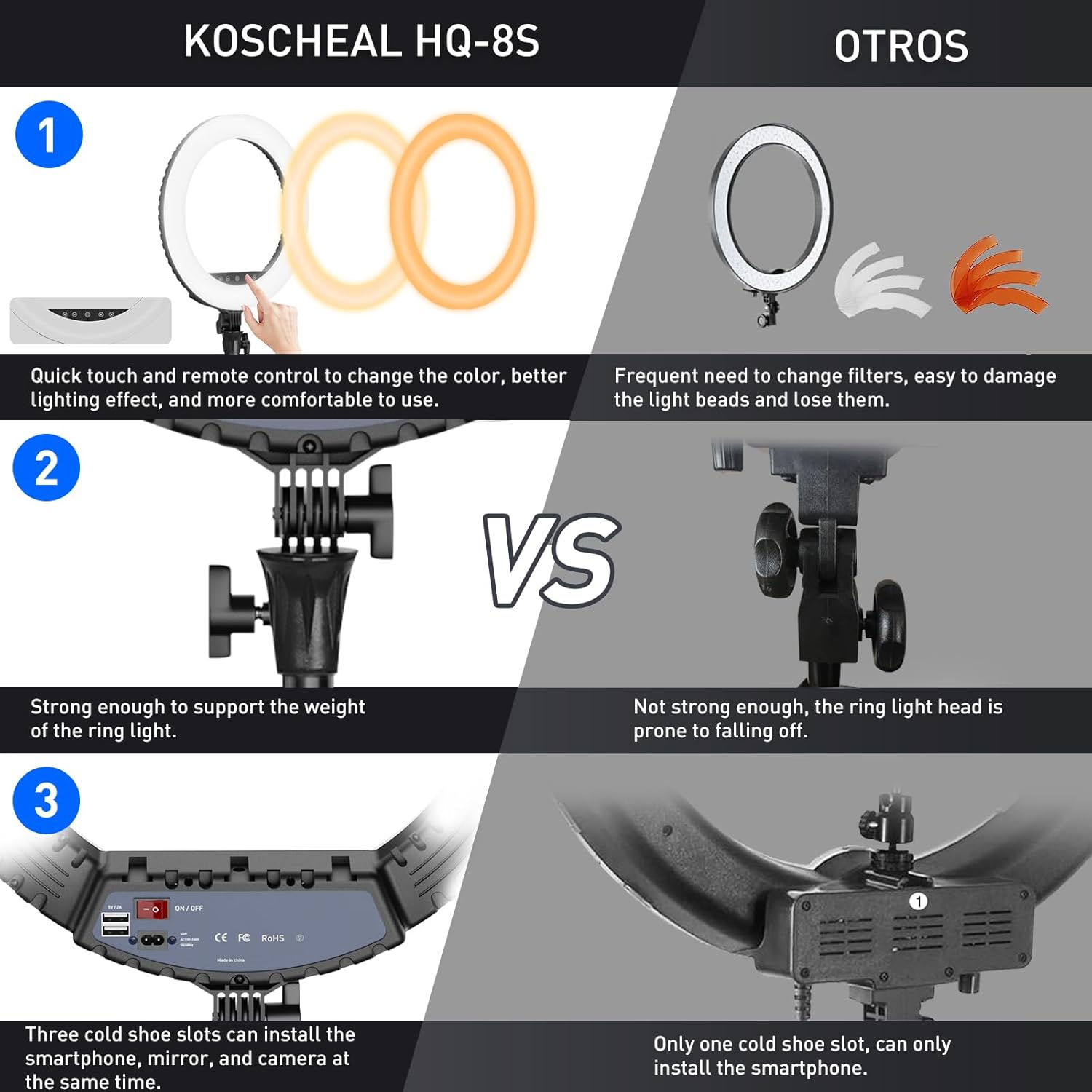 - MÁS BELLA Y CLARA:La luz y la sombra son esenciales para una excelente foto y video shooting.Using KOSCHEAL aro de luz 18 pulgadas hace que sus ojos más encantador, como los ojos de los ángeles.It hace más natural y clara al hacer videos o grabar meeting.It se puede utilizar en YouTube,Facebook Live,online-meeting,TikTok,video-making y Vlog.