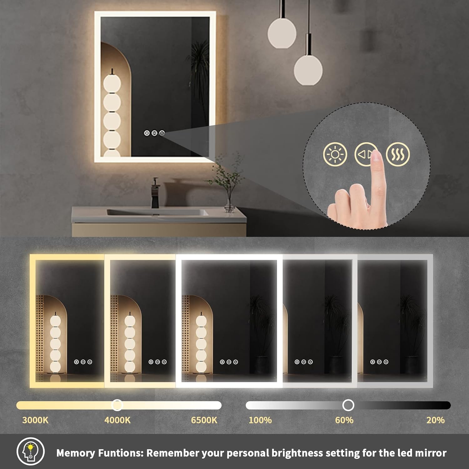 - 【Espejo pared con interruptor táctil y 3 colores ajustable con función de memoria,Antivaho】Este espejo tiene 2 teclas de sensor con atenuación continua,podría ajustar el tono de la luz:luz blanca,luz neutro y luz cálida,al mismo tiempo podría ajustar la densidad de la luz.La función de memoria inteligente registra los ajustes de iluminación anterior y mantiene el estado de iluminación cuando lo enciende de nuevo